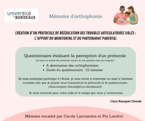 Je m’appelle Loïse Fargeot, étudiante en 5ème année d’orthophonie à Lyon. Je me permets de solliciter votre aide pour la diffusion de mon projet de mémoire.